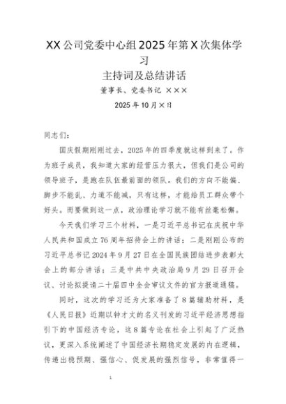 / 党建原创:20250100 2025年第X次:党委理论学习中心组学习主持词及总结讲话(经济发展主题)