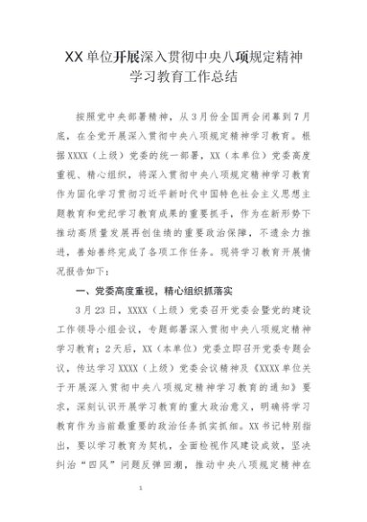 / 党建原创:20250075 XX单位开展深入贯彻中央八项规定精神学习教育工作总结