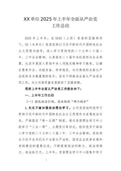 / 党建原创:20250070 XX单位2025年上半年全面从严治党工作总结