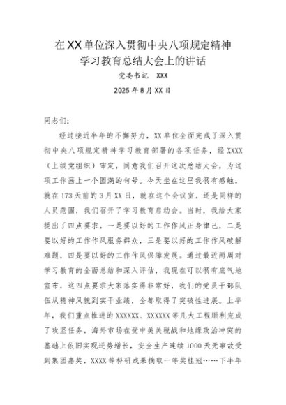 / 党建原创:20250084 在XX单位深入贯彻中央八项规定精神学习教育总结大会上的讲话