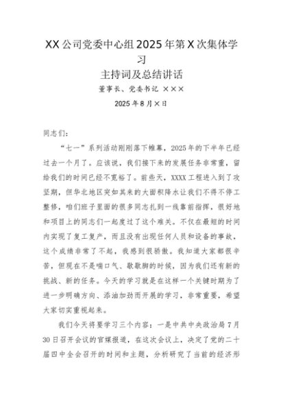 / 党建原创:20250083党委理论学习中心组学习主持词及总结讲话(下半年经济发展等主题)