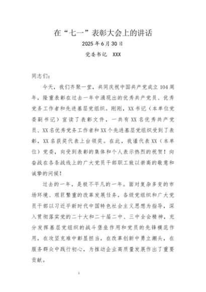 / 党建原创:20250061 基层单位党委书记在“七一”表彰大会上的讲话
