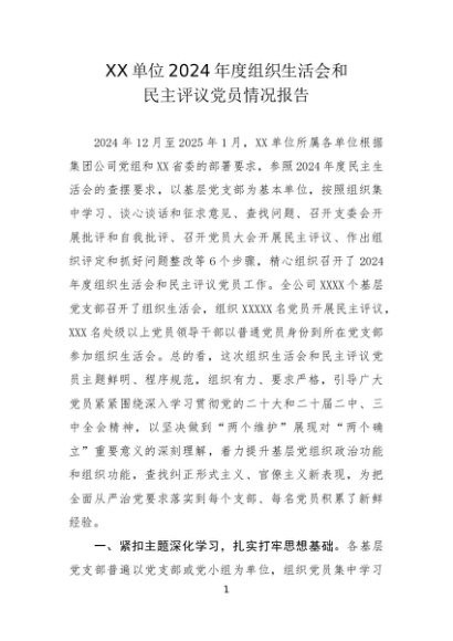 / 党建原创:20250022 XX单位2024年度组织生活会和民主评议党员情况报告