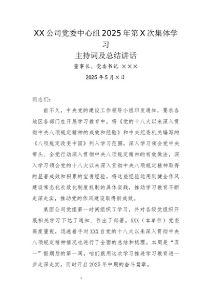 / 党建原创:20250051 2025年第X次:党委理论学习中心组学习主持词及总结讲话(八项规定成效经验主题)