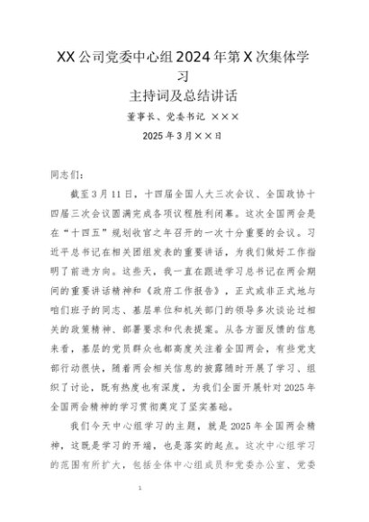 / 党建原创:20250031 党委中心组2024年X月份第X次集体学习主持词(含总结讲话)-2025全国两会专题