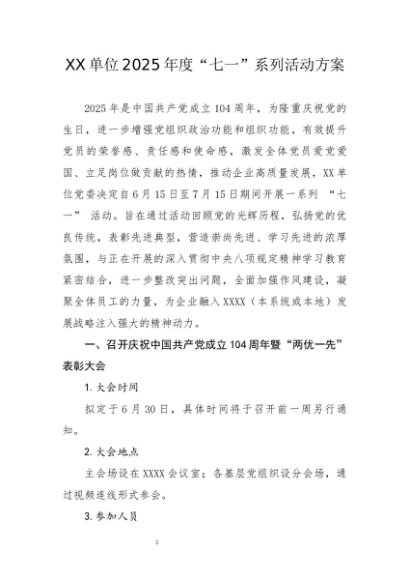 / 党建原创:20250056 XX单位2025年度“七一”系列活动方案