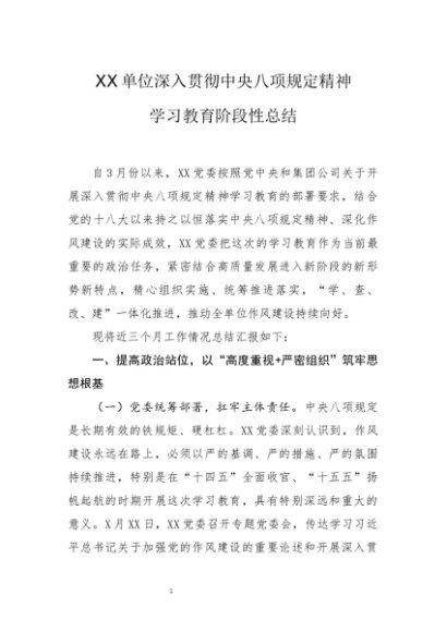 / 党建原创:20250052 XX单位深入贯彻中央八项规定精神学习教育阶段性总结
