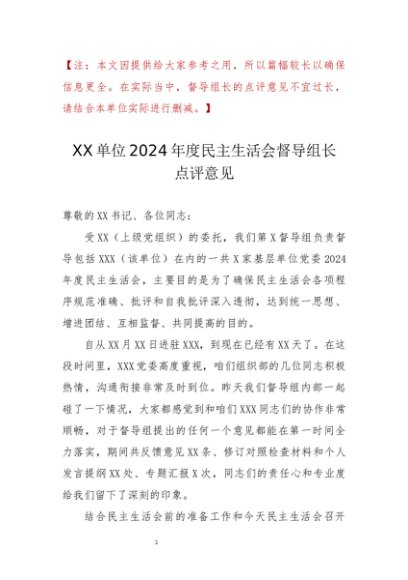 / 党建原创:20250001 XX单位2024年度民主生活会督导组长点评意见