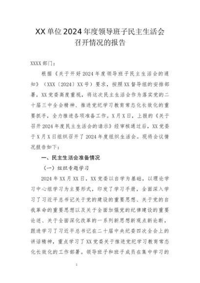 / 党建原创:20250006 XX单位2024年度领导班子民主生活会召开情况的报告