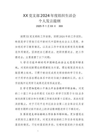 / 党建原创:20250008 XX党支部2024年度组织生活会个人发言提纲