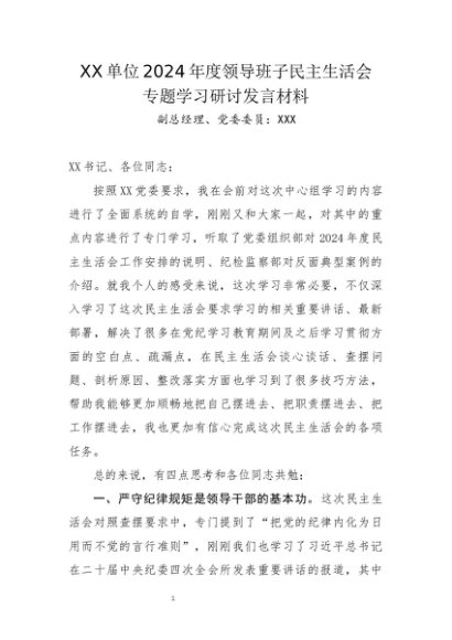 / 党建原创:20250004 XX单位2024年度领导班子民主生活会专题学习研讨发言材料