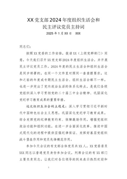 / 党建原创:20250012 XX党支部2024年度组织生活会和民主评议党员主持词