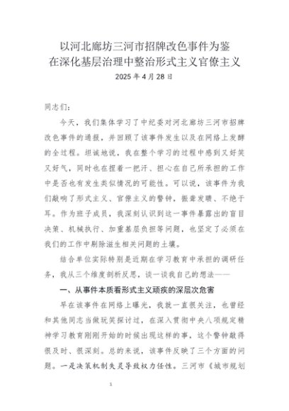 / 党建原创:20250048 反面案例发言材料:以河北廊坊三河市招牌改色事件为鉴
