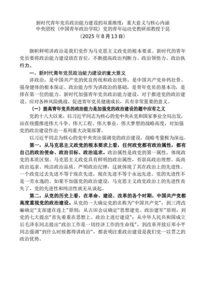 / 党课讲稿:20250813于昆:新时代青年党员政治能力建设的双重维度:重大意义与核心内涵