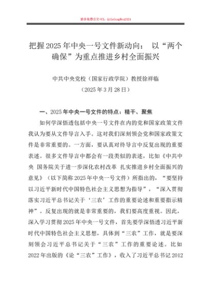 党课讲稿:20250328把握2025年中央一号文件新动向: 以“两个确保”为重点推进乡村全面振兴——中共中央党校(国家行政学院)教授徐祥临