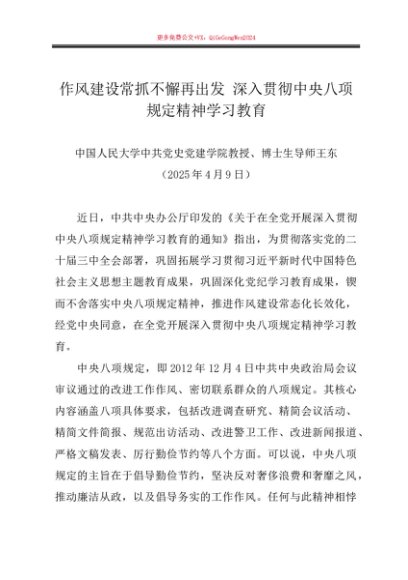 党课讲稿:20250409作风建设常抓不懈再出发 深入贯彻中央八项规定精神学习教育——中国人民大学中共党史党建学院教授、博士生导师王东