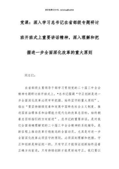 / 党课讲稿:20241127深入学习总书记在省部级专题研讨班开班式上重要讲话精神,深入理解和把握进一步全面深化改革的重大原则