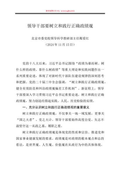/ 党课讲稿:20241115领导干部要树立和践行正确政绩观——北京市委党校领导科学教研部主任鄯爱红