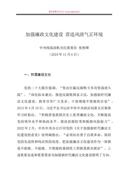 / 党课讲稿:20241106加强廉政文化建设 营造风清气正环境——中央统战部机关纪委委员 张鲁卿