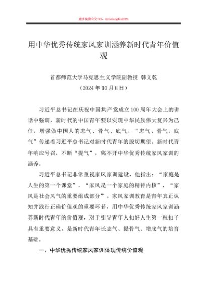 / 党课讲稿:20241008用中华优秀传统家风家训涵养新时代青年价值观——首都师范大学马克思主义学院副教授 韩文乾