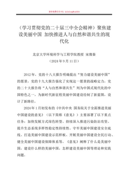 党课讲稿:20240911(学习贯彻党的二十届三中全会精神)聚焦建设美丽中国 加快推进人与自然和谐共生的现代化——北京大学环境科学与工程学院教授 宋豫秦