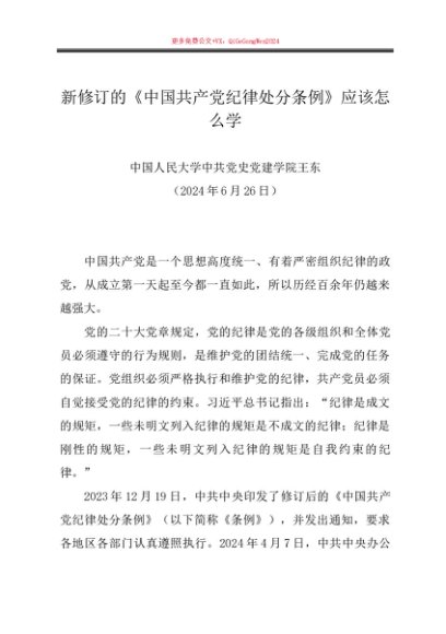 / 党课讲稿:20240626新修订的《中国共产党纪律处分条例》应该怎么学——中国人民大学中共党史党建学院王东