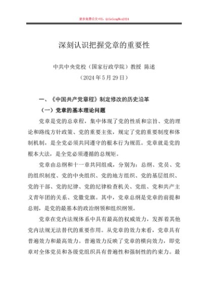 / 党课讲稿:20240529(党纪学习教育、七一党课)深刻认识把握党章的重要性——中央党校(国家行政学院)教授 陈述