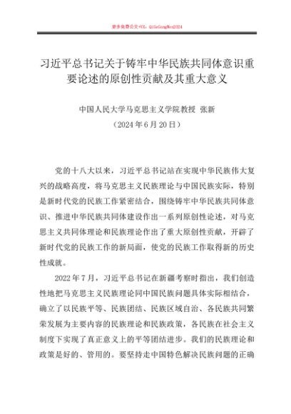 党课讲稿:20240620习近平总书记关于铸牢中华民族共同体意识重要论述的原创性贡献及其重大意义——中国人民大学马克思主义学院教授 张新
