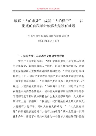 党课讲稿:20240604(党纪学习教育、七一党课)破解“大的难处” 成就“大的样子” 以彻底的自我革命破解大党独有难题——中央宣传部原政研所研究员李俭
