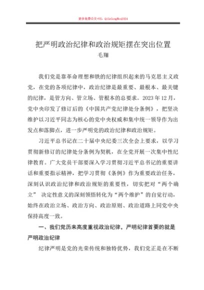 / 党课讲稿:20240420把严明政治纪律和政治规矩摆在突出位置(解读《中国共产党纪律处分条例》)——毛翔