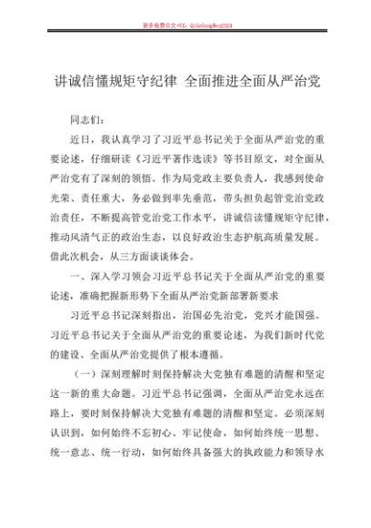 / 党课讲稿:20240119讲诚信懂规矩守纪律 全面推进全面从严治党