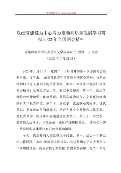 / 党课讲稿:20230321学习贯彻2023年全国两会精神解读政府工作报告—首都师范大学教授王洪波