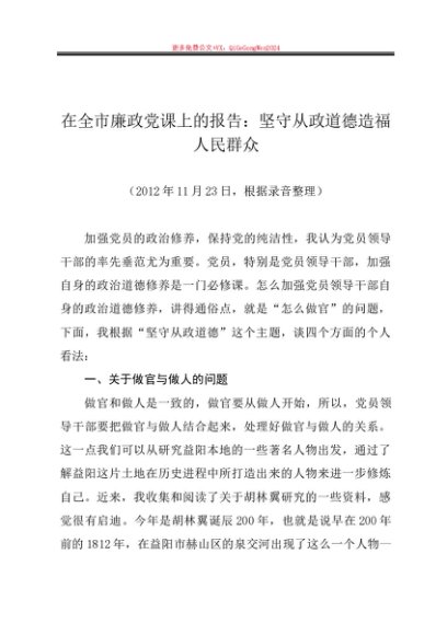 / 党课讲稿:20121123在全市廉政党课上的报告:坚守从政道德造福人民群众