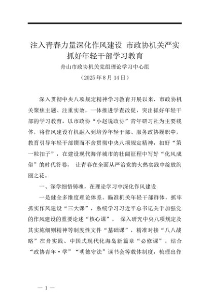党组学习:20250814注入青春力量深化作风建设 市政协机关严实抓好年轻干部学习教育——舟山市政协机关党组理论学习中心组