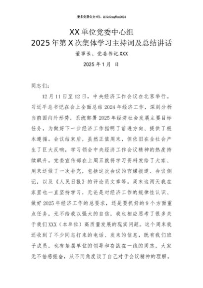 / 党组学习:2025年1月份党委理论学习中心组集体学习主持词(中央经济工作会专题)