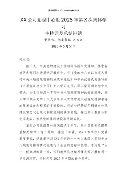 / 党组学习:2025年4月份党委理论学习中心组学习主持词及总结讲话(八项规定成效经验主题)
