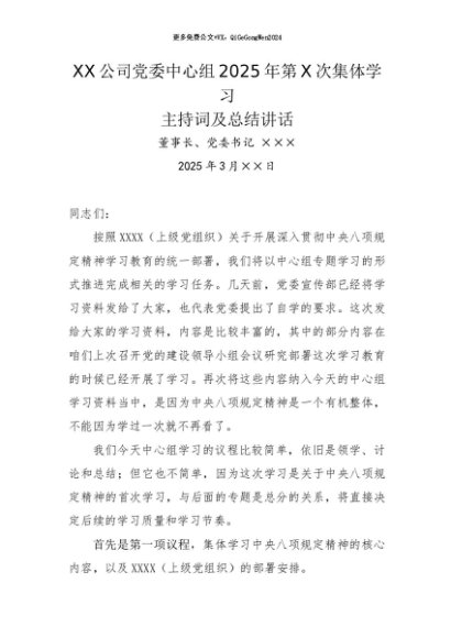 / 党组学习:2025年3月份党委理论学习中心组学习主持词及总结讲话(八项规定学习教育之一)