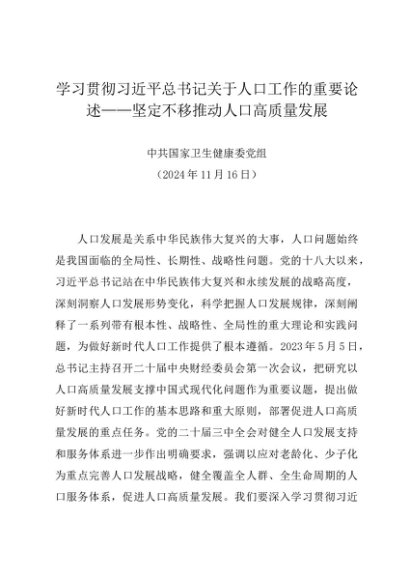 党组学习:20241116学习贯彻习近平总书记关于人口工作的重要论述——坚定不移推动人口高质量发展——中共国家卫生健康委党组