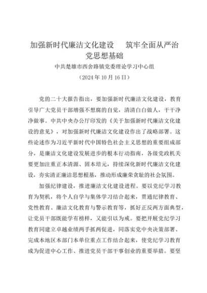 / 党组学习:20241016(学习贯彻《关于加强新时代廉洁文化建设的意见》)筑牢全面从严治党思想基础——楚雄市西舍路镇党委