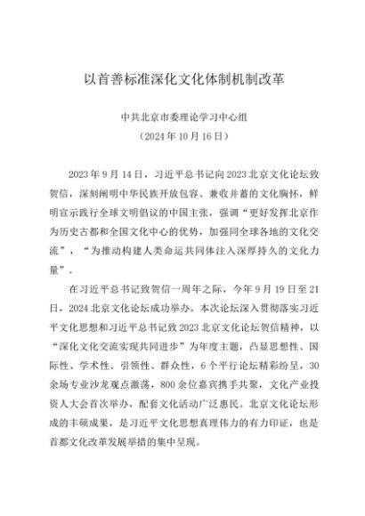 党组学习:20241016(北京文化论坛致贺信1周年)以首善标准深化文化体制机制改革——北京市委理论学习中心组