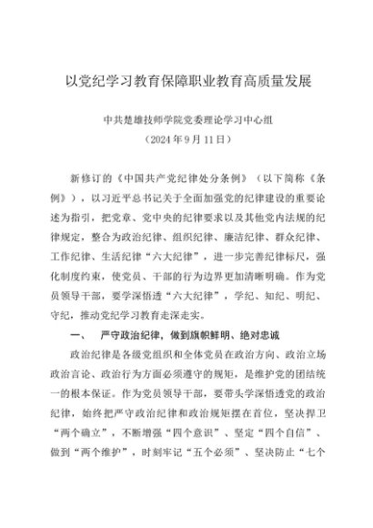 党组学习:20240930(党纪学习教育)以党纪学习教育保障职业教育高质量发展——楚雄技师学院党委理论学习中心组
