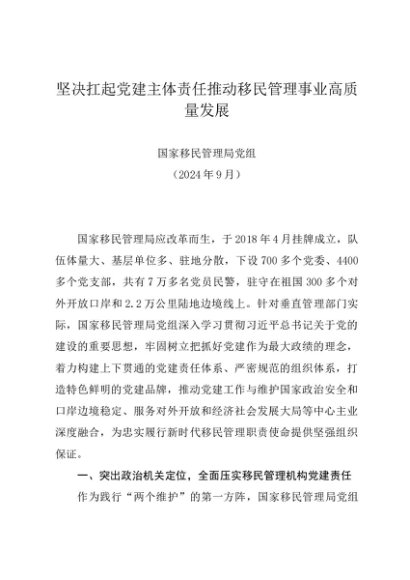 党组学习:20240930坚决扛起党建主体责任推动移民管理事业高质量发展经验做法——国家移民管理局党组