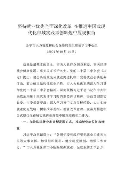 党组学习:20241014(就业工作)坚持就业优先全面深化改革 在推进中国式现代化市域实践再创辉煌中展现担当——金华市人力资源和社会保障局党组