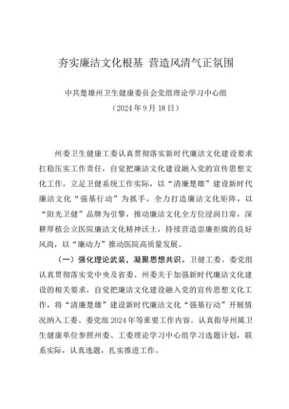 党组学习:20240918(廉政建设)夯实廉洁文化根基 营造风清气正氛围——楚雄州卫生健康委员会党组理论学习中心组
