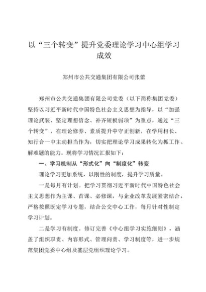 党组学习:20240730(经验交流)以“三个转变”提升党委理论学习中心组学习成效——郑州市公共交通集团有限公司
