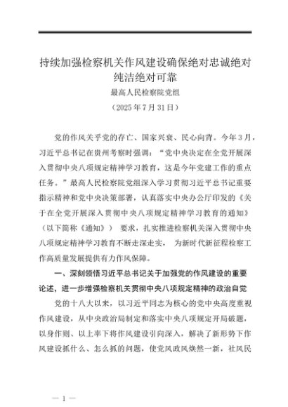党组学习:20250731持续加强检察机关作风建设确保绝对忠诚绝对纯洁绝对可靠——最高人民检察院党组