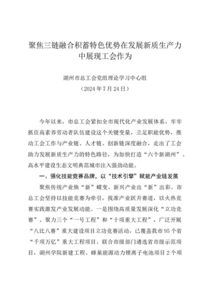 / 党组学习:20240724聚焦三链融合积蓄特色优势在发展新质生产力中展现工会作为——湖州市总工会党组理论学习中心组