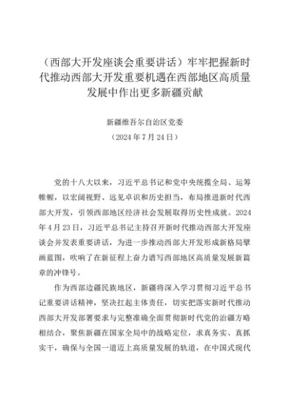 党组学习:20240724(西部大开发座谈会重要讲话)牢牢把握新时代推动西部大开发重要机遇在西部地区高质量发展中作出更多新疆贡献——新疆维吾尔自治区党委
