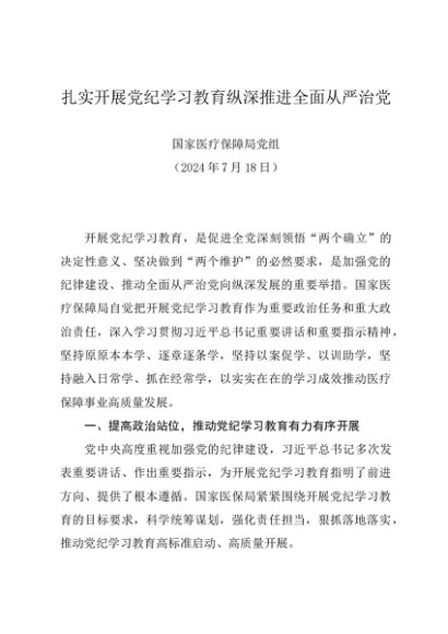 党组学习:20240718扎实开展党纪学习教育纵深推进全面从严治党——国家医疗保障局党组