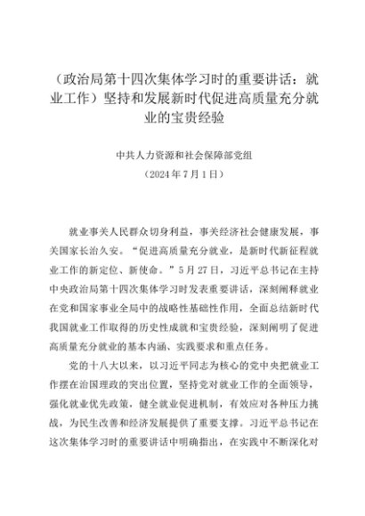 党组学习:20240701(政治局第十四次集体学习时的重要讲话:就业工作)坚持和发展新时代促进高质量充分就业的宝贵经验——人力资源和社会保障部党组